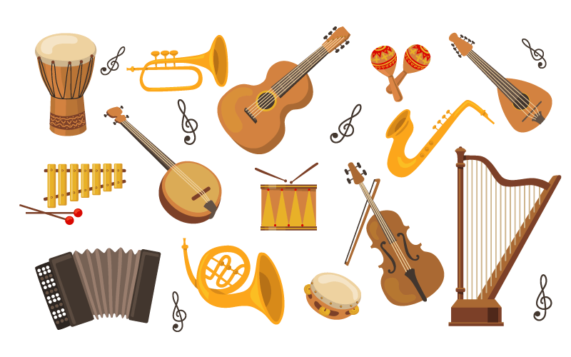 學過音樂都要學會看音符,八分音符、十六分音符、二分音符與樂譜,才能彈奏出一首曲目並且經過充份練習。樂器種類可分為三角鐵、鼓、響板、吉他、直笛、鋼琴、大提琴、小提琴等。