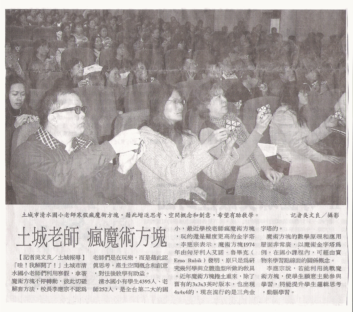 「哇!我解開了!」土城市清水國小老師們利用寒假,拿著魔術方塊不停轉動,彼此切磋解套方法,校長李應宗不認為老師們是在玩樂,而是藉此認真思考,產生空間概念和創意,對往後教學有助益。